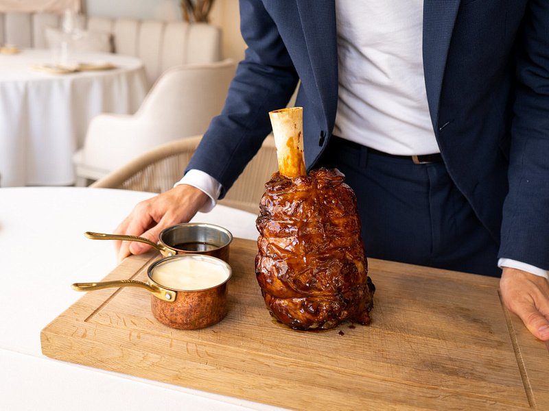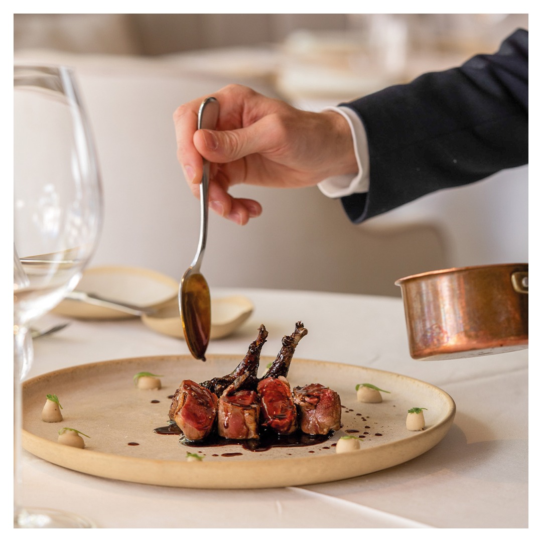 En cuanto a platos principales, el jarrete de ternera estilo Santi Santamaría, con puré de patata y su propio jugo, con el que rinden homenaje al desaparecido chef, es una magnífica opción, así como el solomillo Rossini conon salsa Perigourdine o el cordero lechal manchego, cocinado “a la arcilla”, con su jugo y pimientos de piquillo a la brasa.