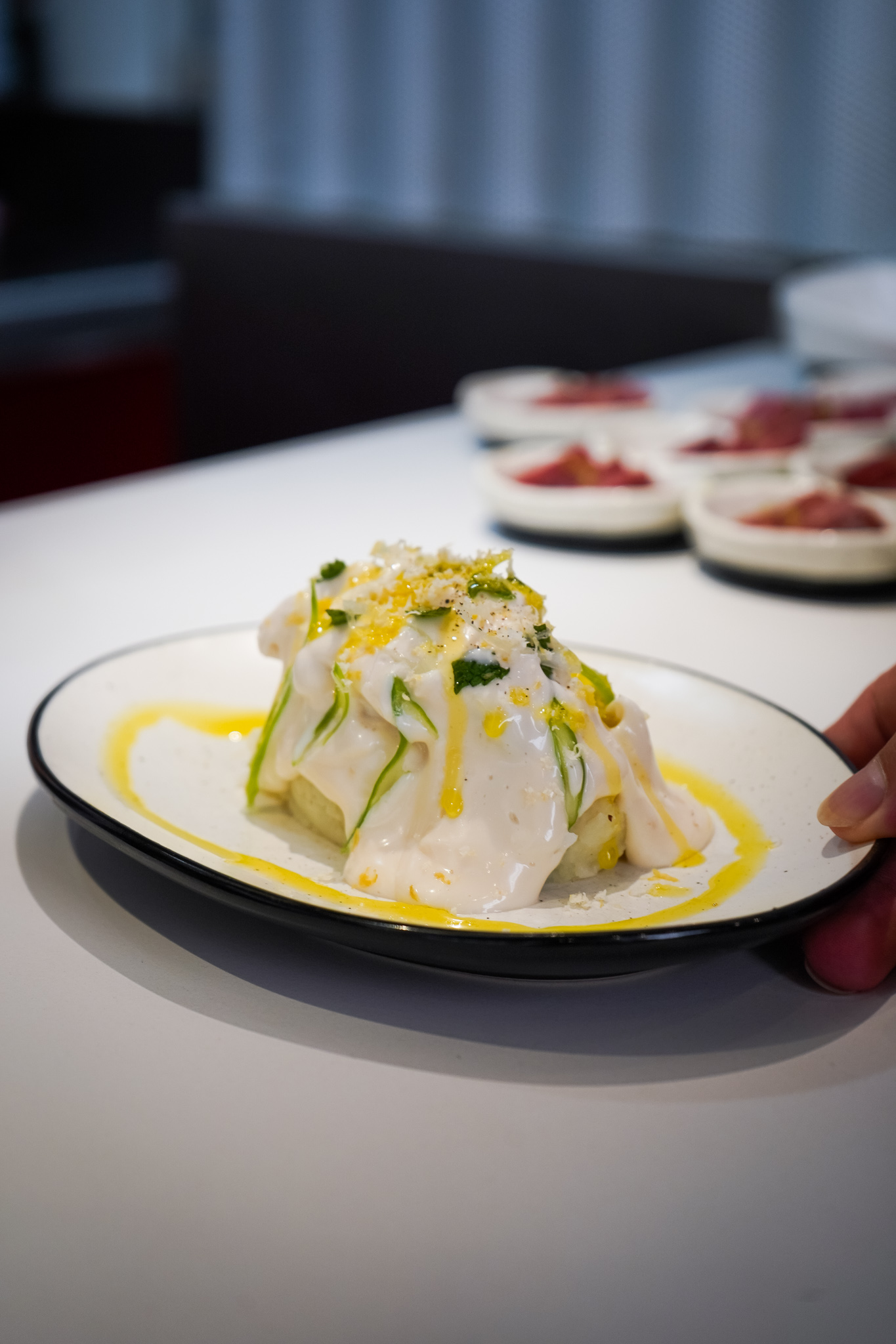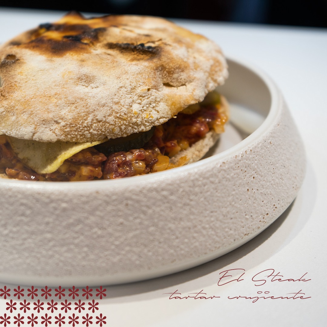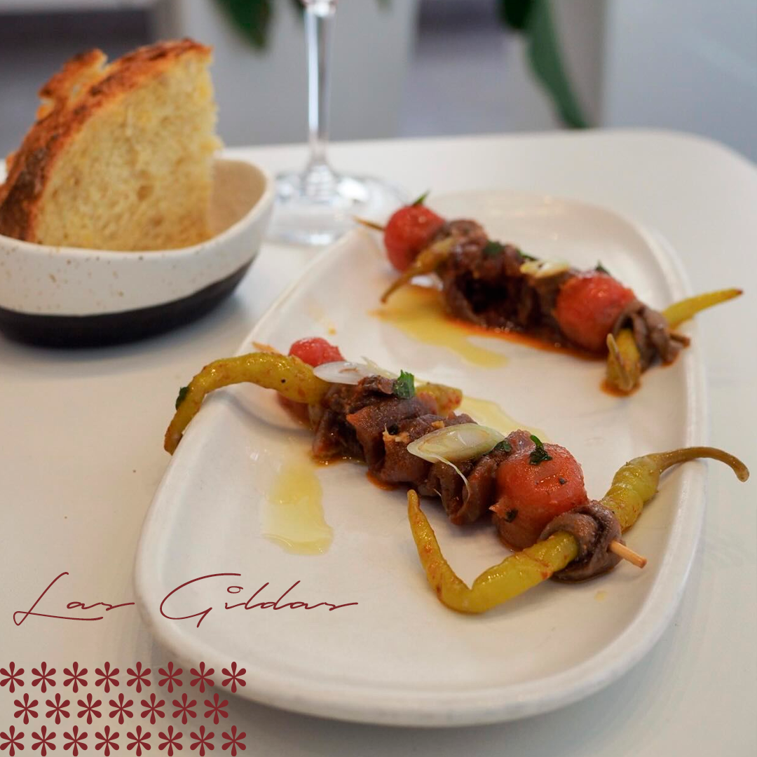 Entre las propuestas que ofrece y que varía en temporada está su ensaladilla de merluza del Cantábrico a base de patata rota, judía, merluza y su emulsión, que sigue la estela de otra ensaladilla que sirve en La Cosmopolita; o la gilda de Almadraba gaditana de atún, tomate, piparra y anchoa, homenaje a Carlos del Portillo del restaurante Bistronomika.